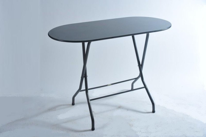Ovale sta-tafel met een zwart gespikkeld blad. Het is niet mogelijk om deze sta-tafel te voorzien van een stretch rok. Wel tafellinnen is mogelijk.